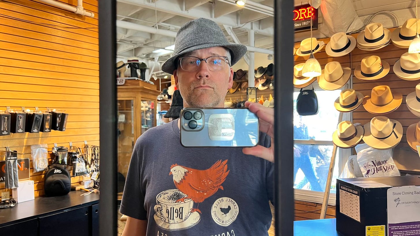 At a hat shop, we confirmed the fact that I look ridiculous in every hat ever made. I did not buy a hat.